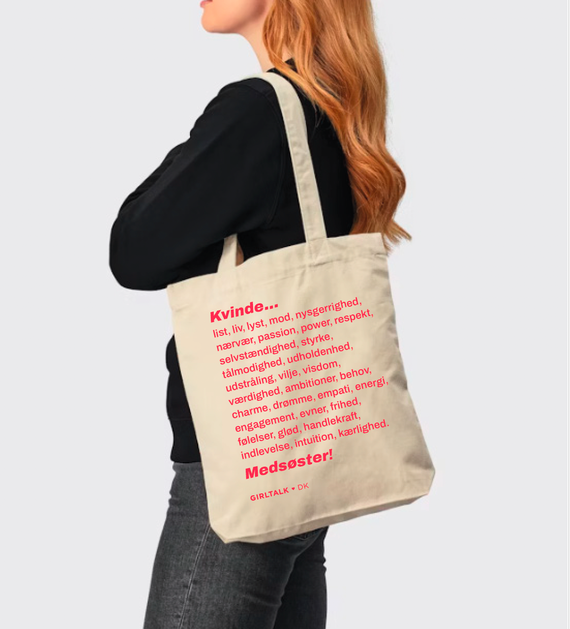 I anledning af Kvindernes Kampdag har vi skabt denne mulepose – en påmindelse om, at vi som medsøstre løfter hinanden. Ved at købe den støtter du GirlTalks arbejde for bedre trivsel blandt piger og unge kvinder.